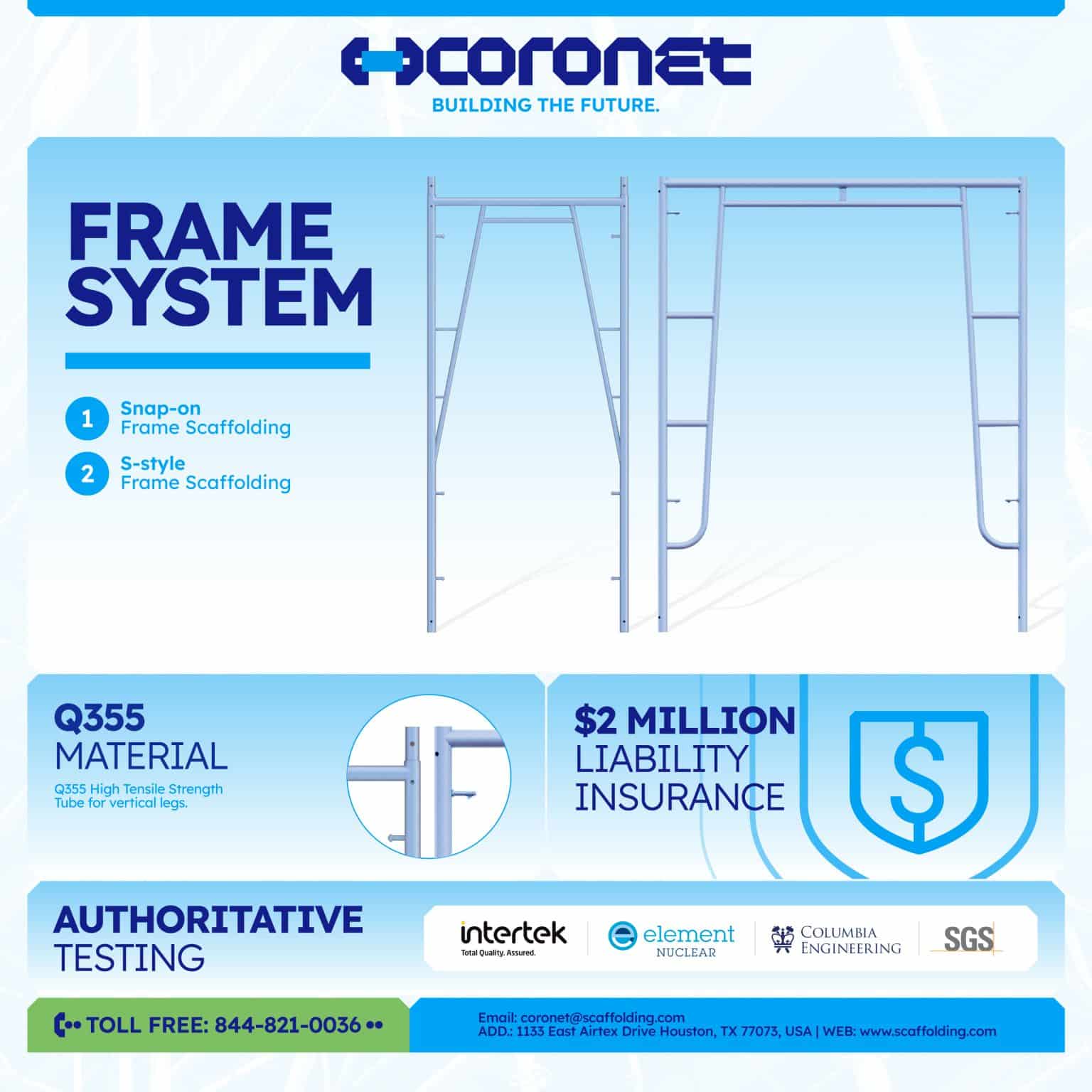 Coronet Frame System โ Strength, Safety & Certification You Can Trust! When it comes to scaffolding, quality and safety are non-negotiable. Thatโs why our Frame System is built with: โ Q355 High-Strength Steel โ Ensuring superior durability and performance. โ Certified by Independent Third-Parties โ Verified for reliability and compliance. โ $2 Million Liability Insurance […]